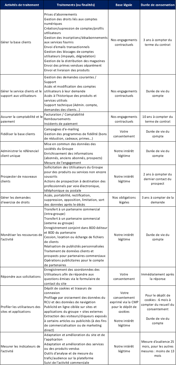 Le tableau ci-dessous présente pour chacune des finalités que nous poursuivons, la durée de conservation des données, associée au fondement légal du traitement.